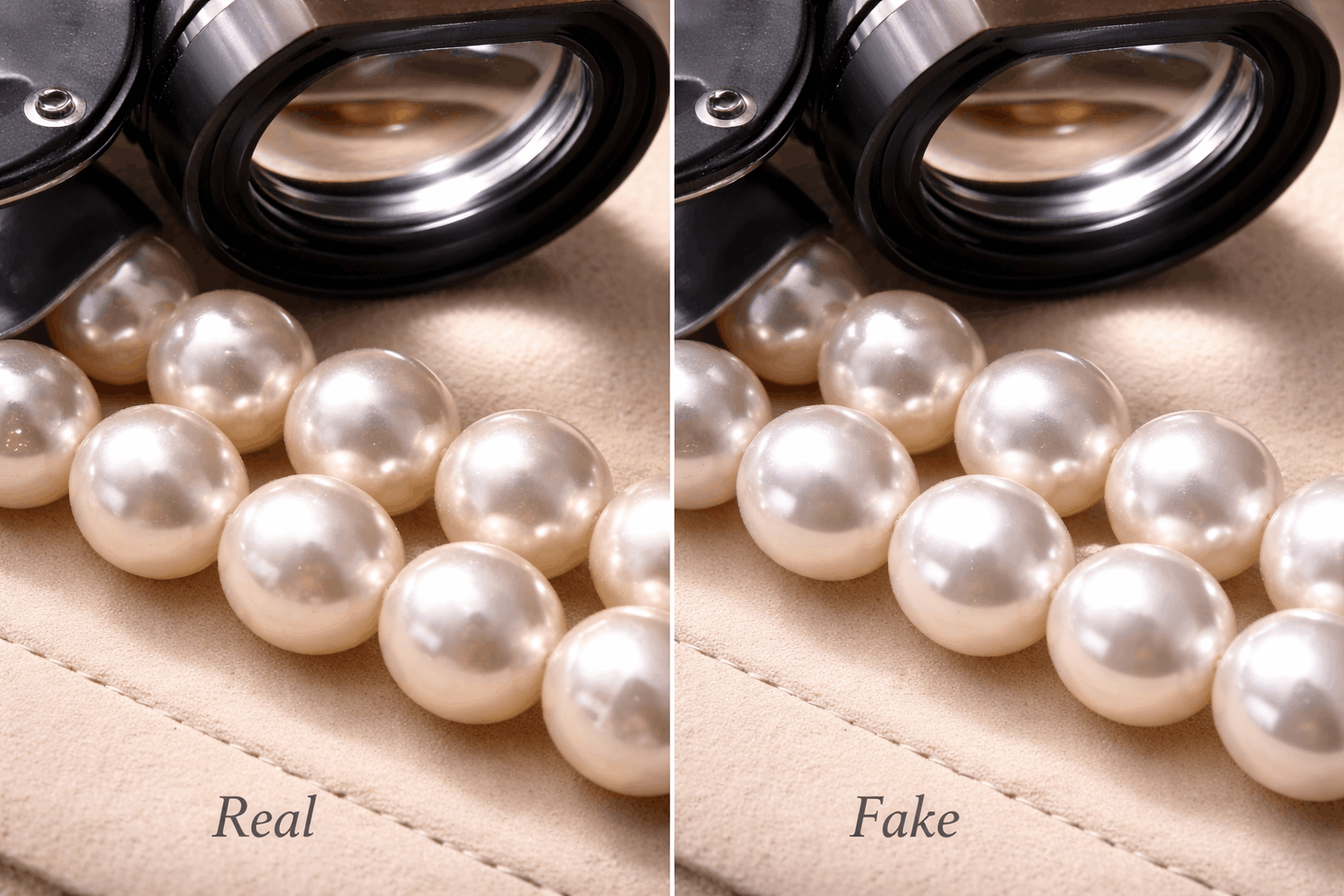 De tandentest werkt verrassend goed voor snelle authenticatie. Wrijf de parel zachtjes langs je voortanden. Echte parels voelen licht korrelig aan door de gelaagde nacre-structuur. Nepparels voelen glad als glas of plastic. Ja, het ziet er raar uit, maar het is de snelste manier om duidelijke vervalsingen te betrappen.